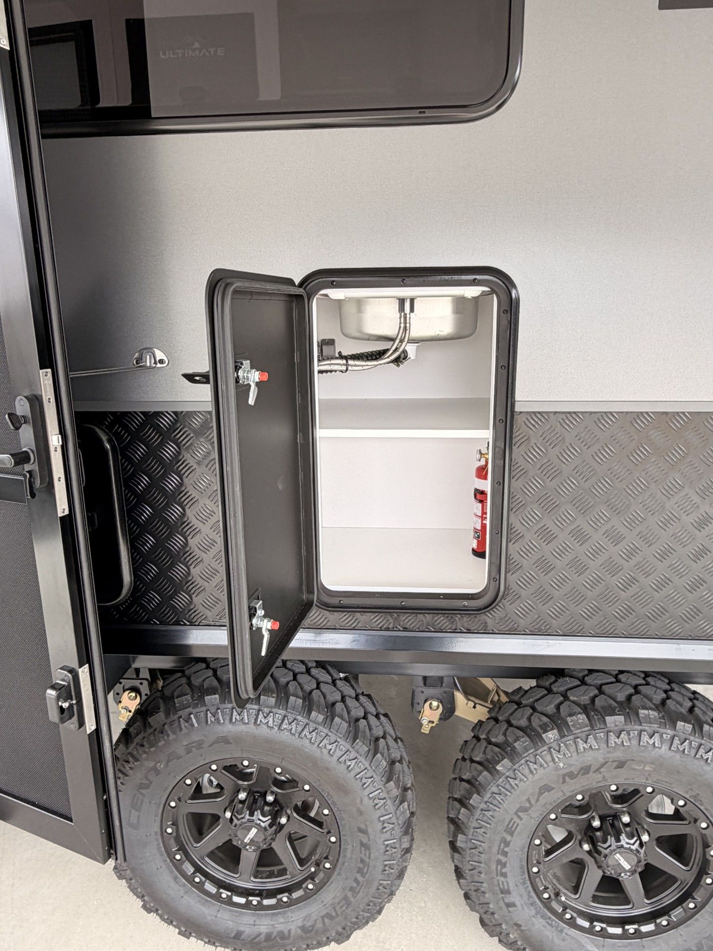 | Internal Kitchen with overhead cabinets including Dometic Two Burner Stove with Dometic glass lid sink, overhead Rangehood, splashback, lockable drawers and doors |