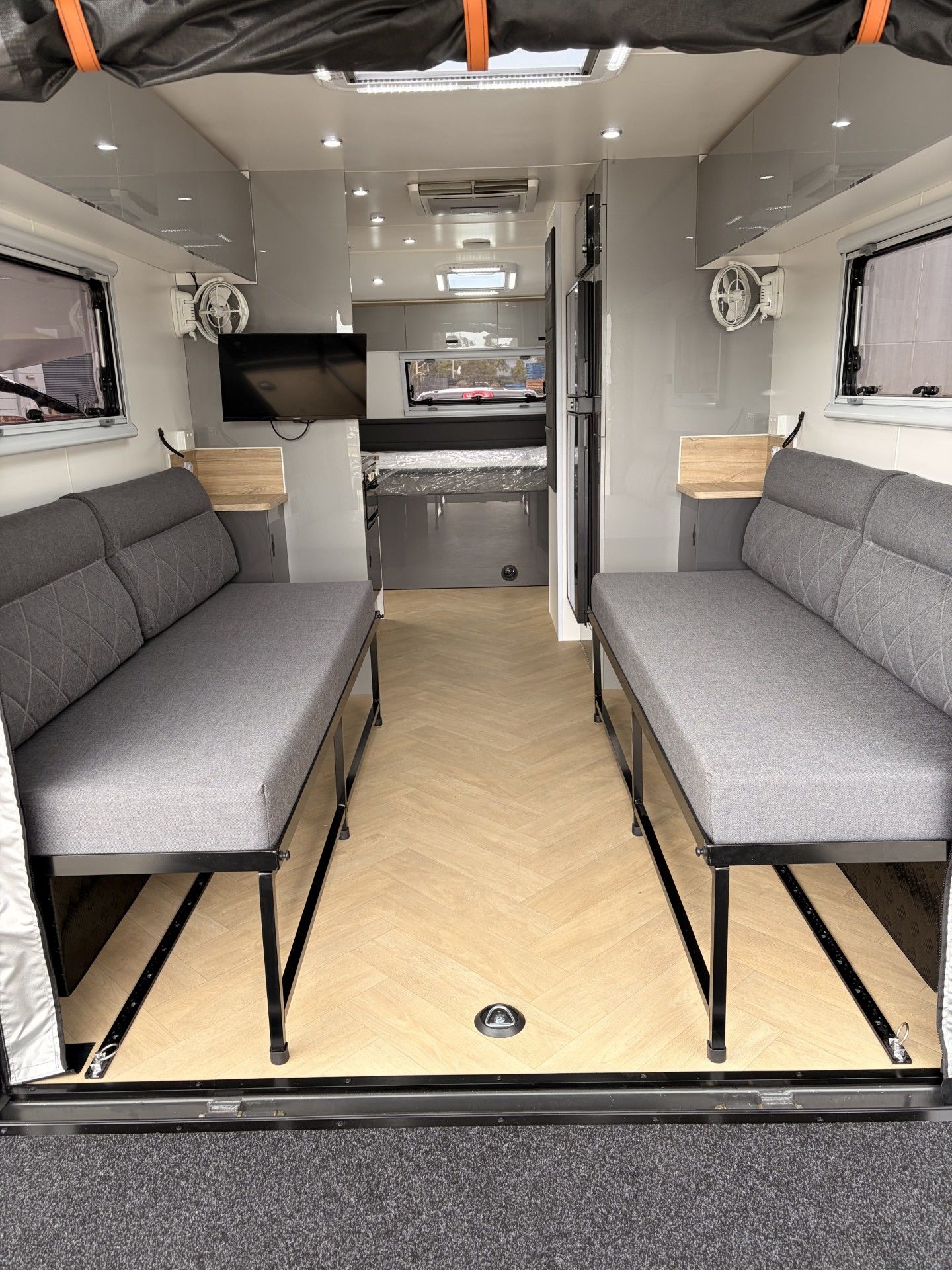 Trail Boss GTR 20'When bigger is better. The Trail Boss GTR is the big brother to our ever popular 16' model. With all the standard inclusions of the 16', it includes a long list of upgrades such as dual independent suspension, an upgraded larger rear garage area, longer rear beds, standard 188 Litre fridge, internal Kitchen with complete cooking capabilities, larger bench space, and a larger Air Conditioner coming as standard, the Trail Boss GTR is the complete family Toy Hauler. Warranty
