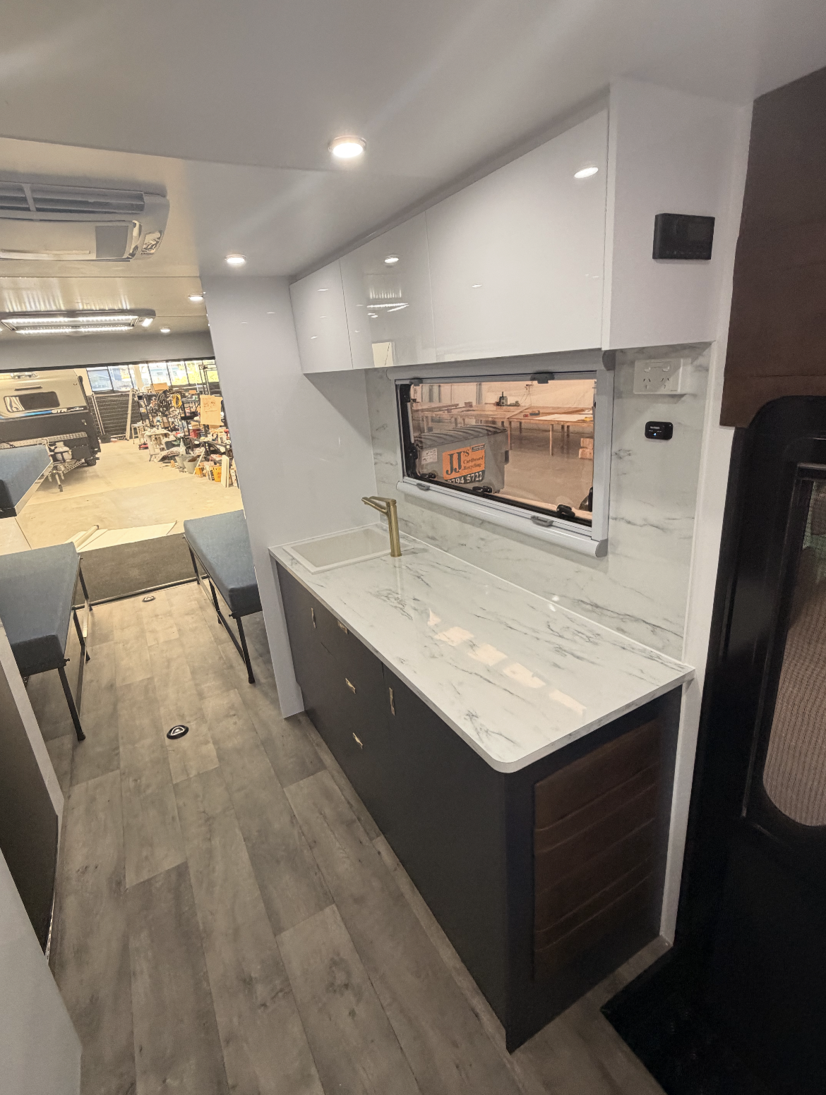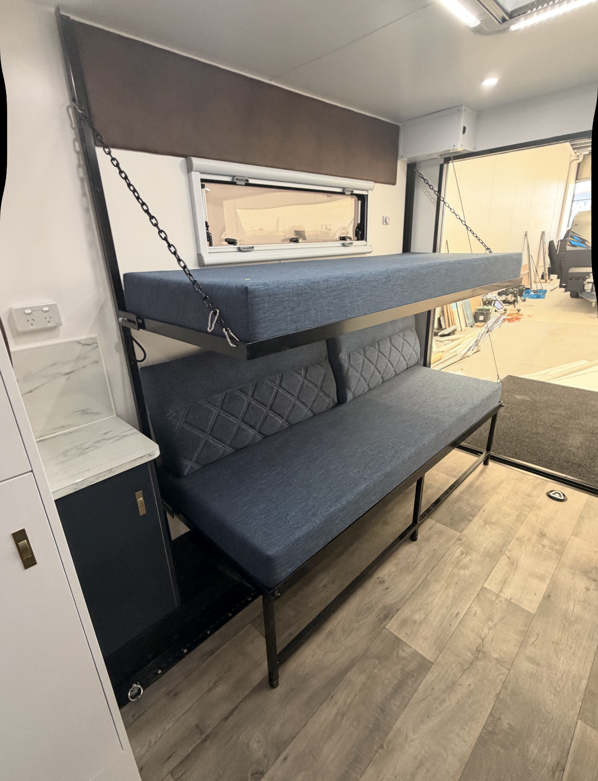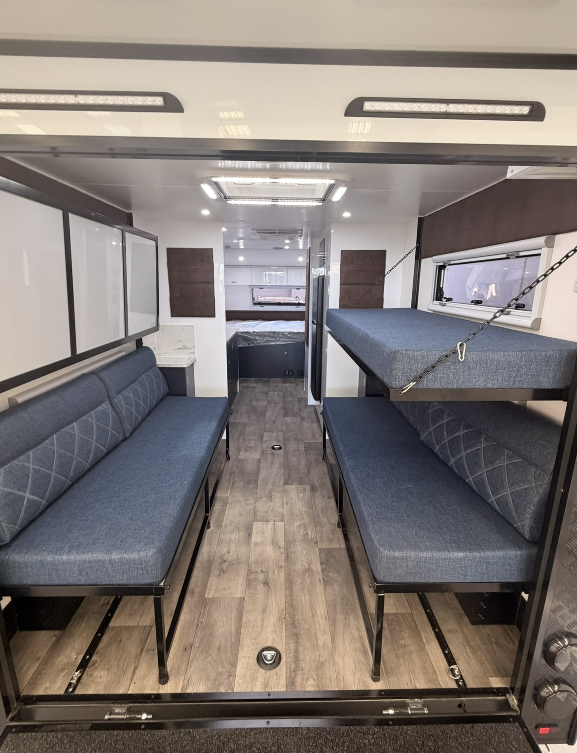 | Separate rear bedroom/garage with Concertina door divider (2350mm length x 1850mm wide) | Battery monitor and water gauges |
