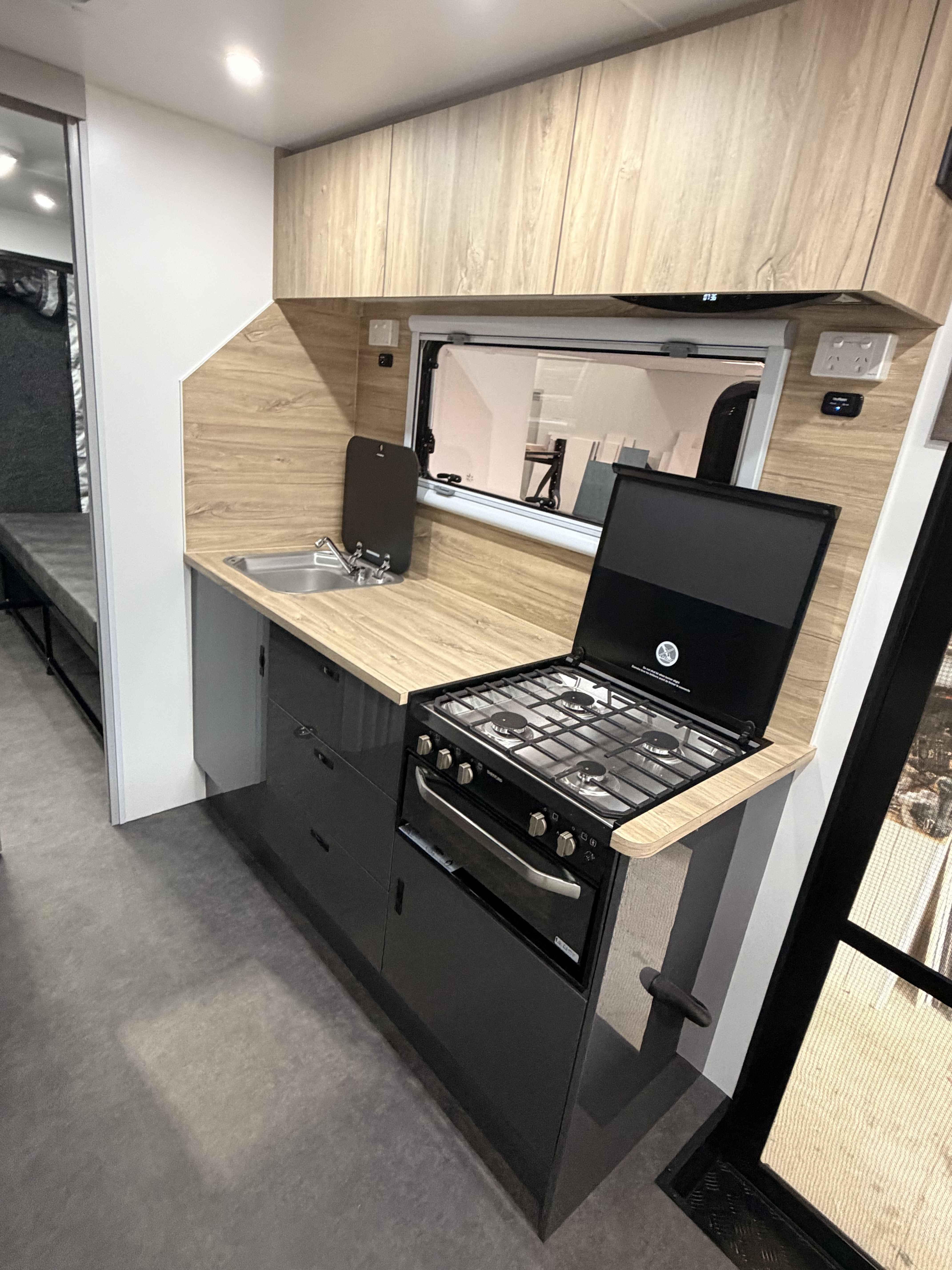 | Internal Kitchen with overhead cabinets including an upgrade to Thetford Mini Grill, sink and mixer tap, overhead Rangehood, splashback, lockable drawers and doors |